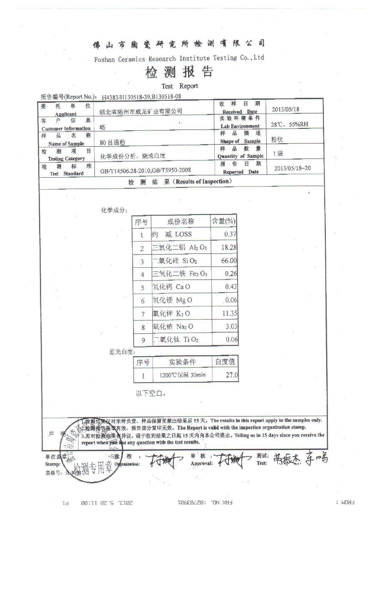 俗话说“货比三家”,现在客户买东西都是喜欢东看看,西瞅瞅,觉得哪家实惠、质量过关才会去订购。 那 随州市威龙矿业的质量到底怎么样呢 小编随着和冯董事长还有现场工作人员到现场去参观了解了下 冯董事长介绍说,威龙矿业现有两条先进的钾长石生产线,一条是雷蒙磨生产线,一条是冲击破生产线,年产钾长石产品5万吨,具有年生产钾长石5万吨的生产能力. ,并还详细介绍了公司生产流程图:一次洗矿 → 二次洗矿→晒矿 → 传送进料 → 第一道永磁选 → 进主机 → 出料 → 第二道永磁选 → 第三道电磁选 → 第四道电磁选 → 振动筛分筛 → 分装 → 过磅 → 入库→出库→装车→运输 说到这,冯董事长让工作人员从文件夹里拿出佛山市研究中心检测的报告给记者看,小编随机让摄像大哥拍了几张,以此让大家更清晰透彻了解。 |